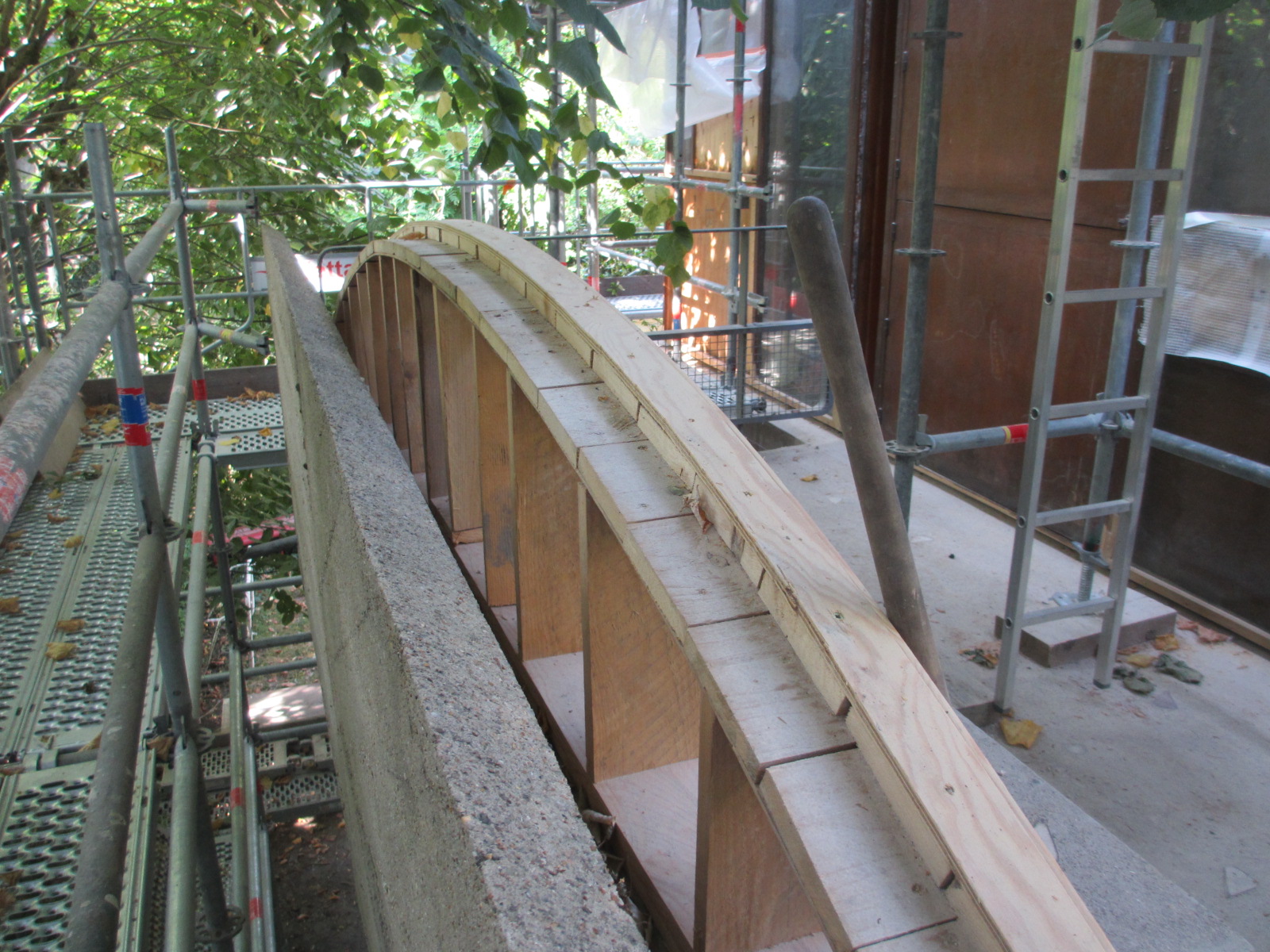 La méthode par “coulage” est plutôt indiquée pour la réparation d’ensembles importants (parapets) mais aussi d’éléments porteurs (poutres, piles, poteaux). On crée un coffrage pour contenir le matériau (qu’il s’agisse de béton ou de mortier) afin de pour donner à l’ensemble la forme voulue. Ce coffrage peut être en bois ou en métal, en acier ou en béton vibré, et est retiré une fois le béton sec.